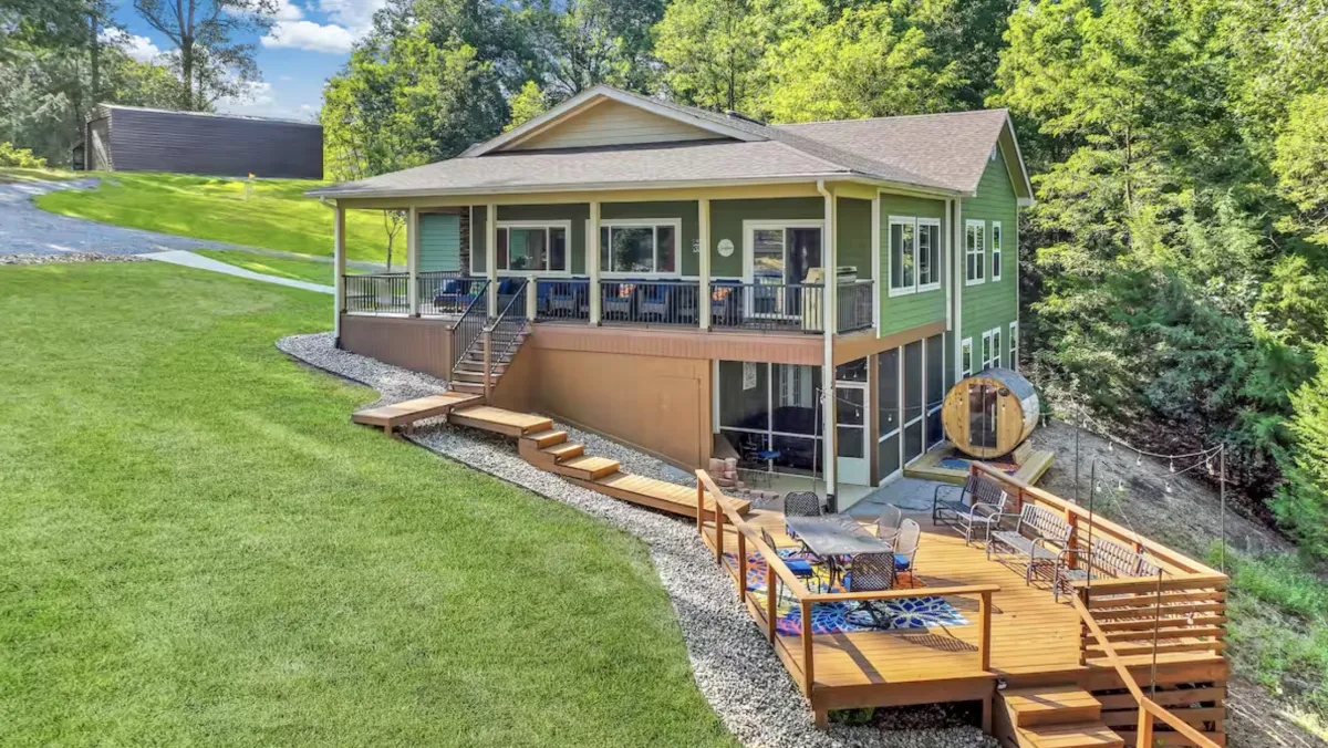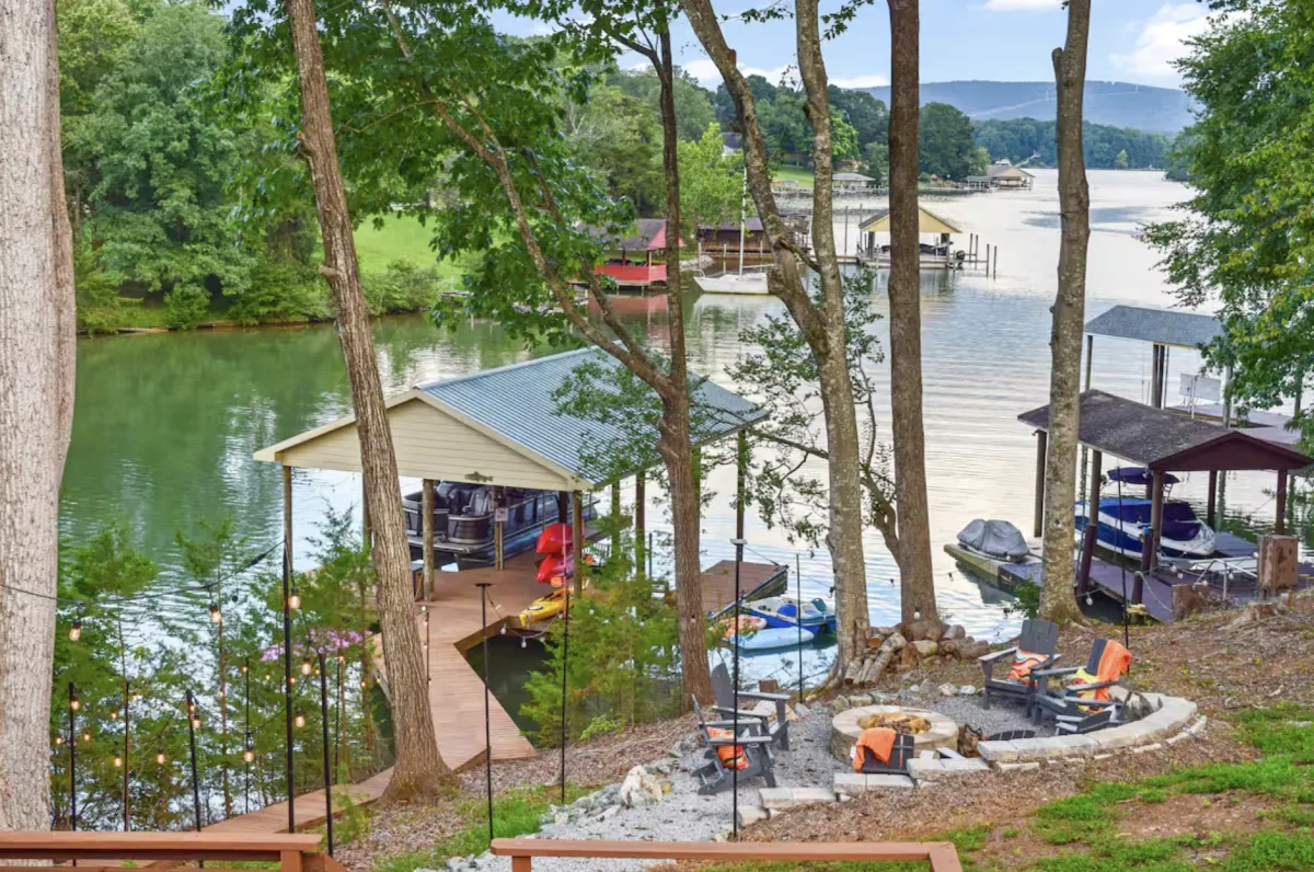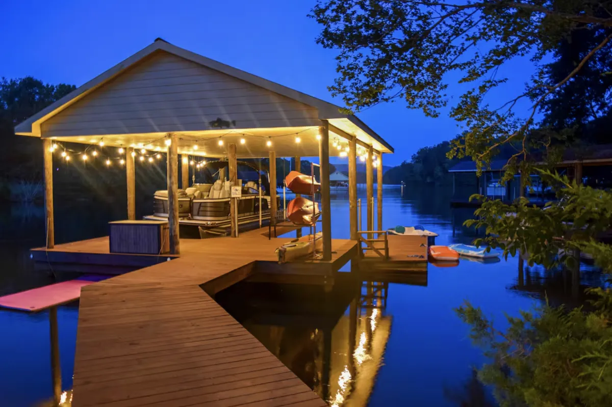 Dock, swim, relax, repeat. Escape to tranquil waterfront bliss! Quiet cove with kayaks, paddle boards & paddle boat. Relax in hot tub & barrel sauna. Game room features pool table, shuffleboard, arcade games & basketball. Luxury amenities include spa showers, whirlpool tub, smart tv’s, Infinity game table, fully stocked kitchen & work space with desktop computer. Perfect for s’mores at the fire pit, fishing, water sports or peaceful getaways. Your private oasis awaits!