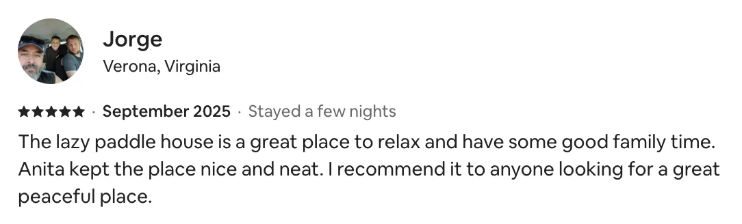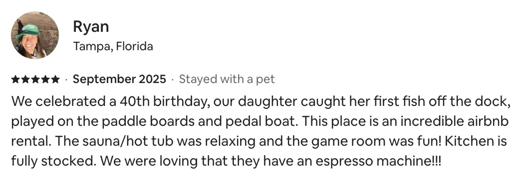 "The Lazy Paddle was the neatest place we’ve ever stayed. Quiet cove with big front porch overlooking fire pit and dock. The kids loved the old school paddle boat & we felt comfortable letting our 9 and 12 year old paddle around, considering there’s almost no traffic that comes through the cove. The kids played in the game room while the adults sat by the fire at night. As if this wasn’t enough, there’s a hot tub, a legit sauna that easily fits 4 people, and a movie theater! The Lazy Paddle has everything you need for a week's stay to entertain the whole crew!" Jon